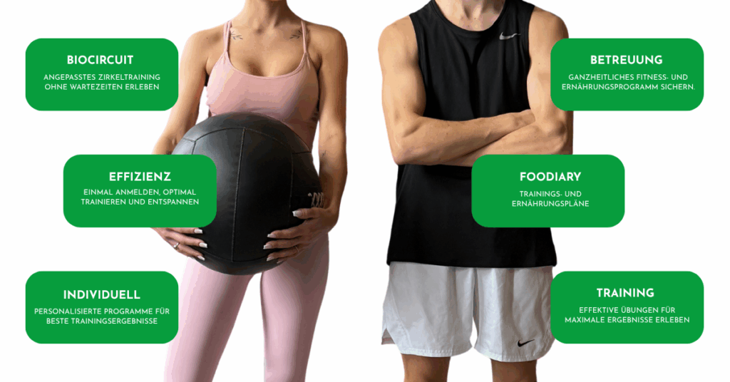 Erlebe optimiertes Zirkeltraining ohne Wartezeiten und personalisierte Programme für beste Ergebnisse. Sichere dir ganzheitliche Fitness- und Ernährungsprogramme und profitiere von maßgeschneiderten Trainings- und Ernährungsplänen für maximale Ergebnisse.